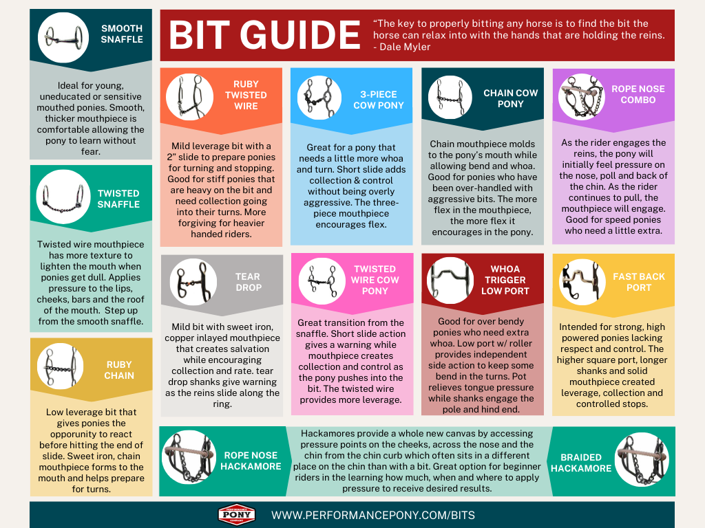 Not sure what bit will fit? Click on the bit guide to compare bits or fill out the questionnaire on the "Help Me Choose" page and you'll be contacted by the Performance Pony Company to discuss the best option for your pony and rider.